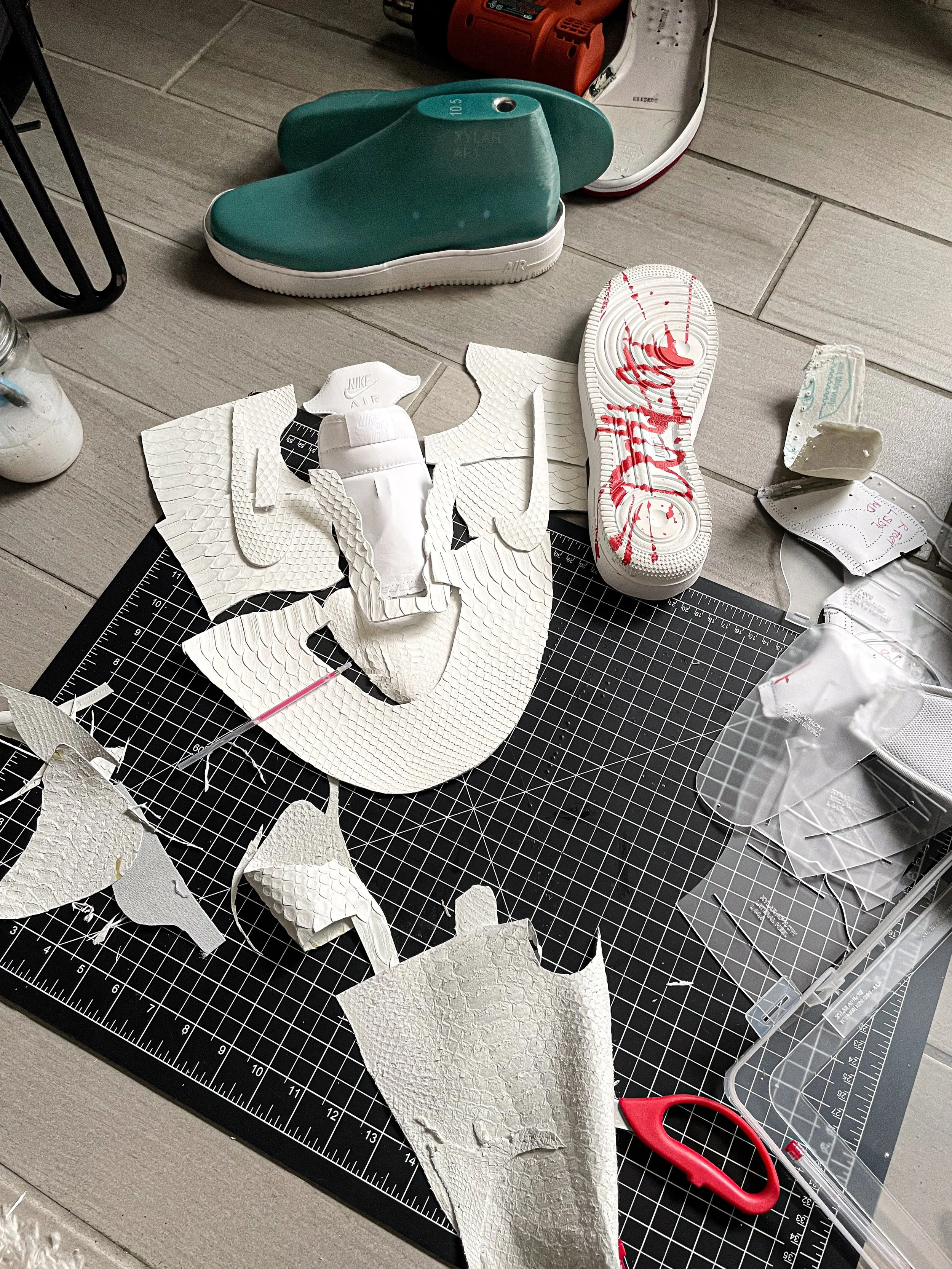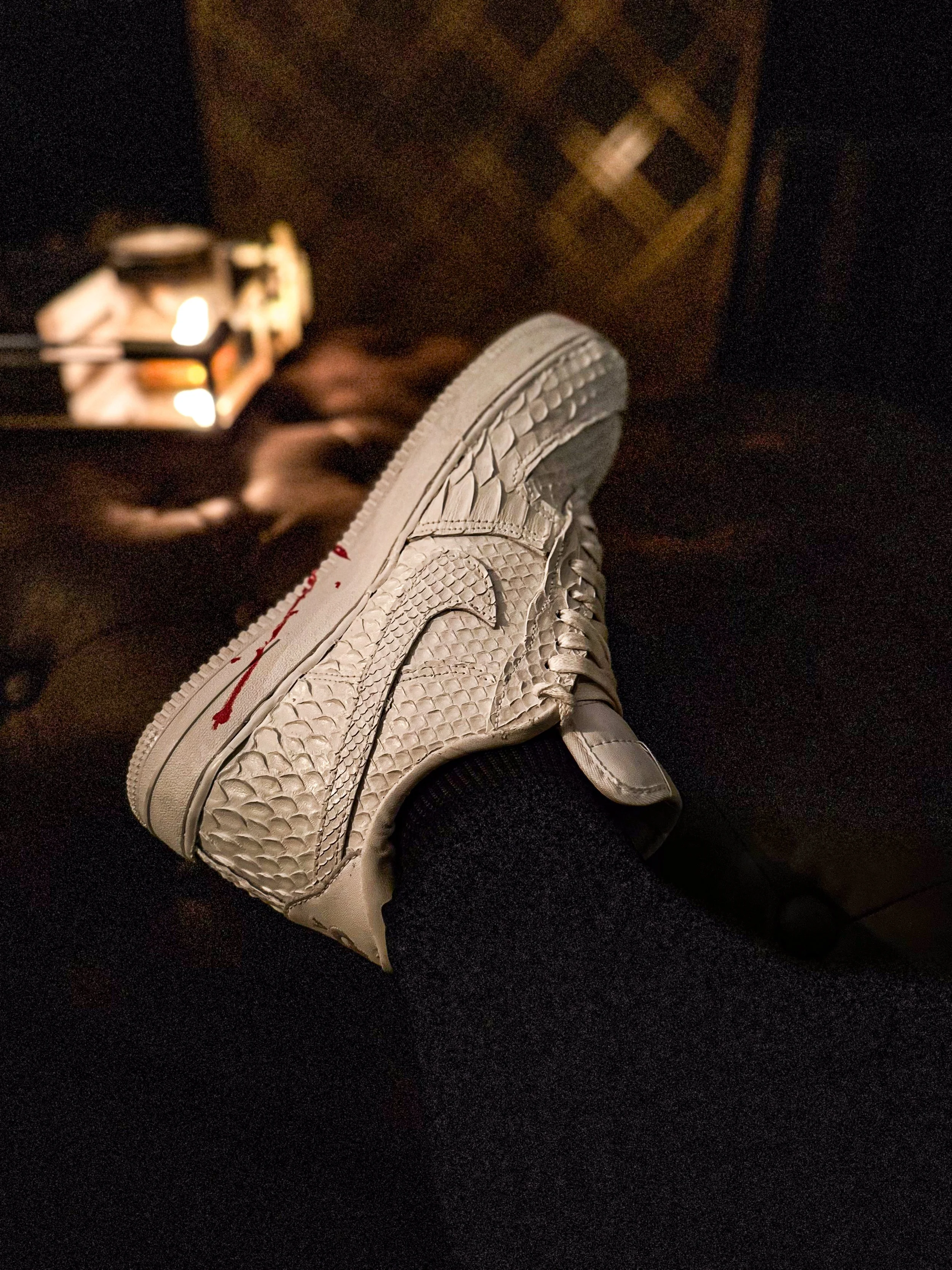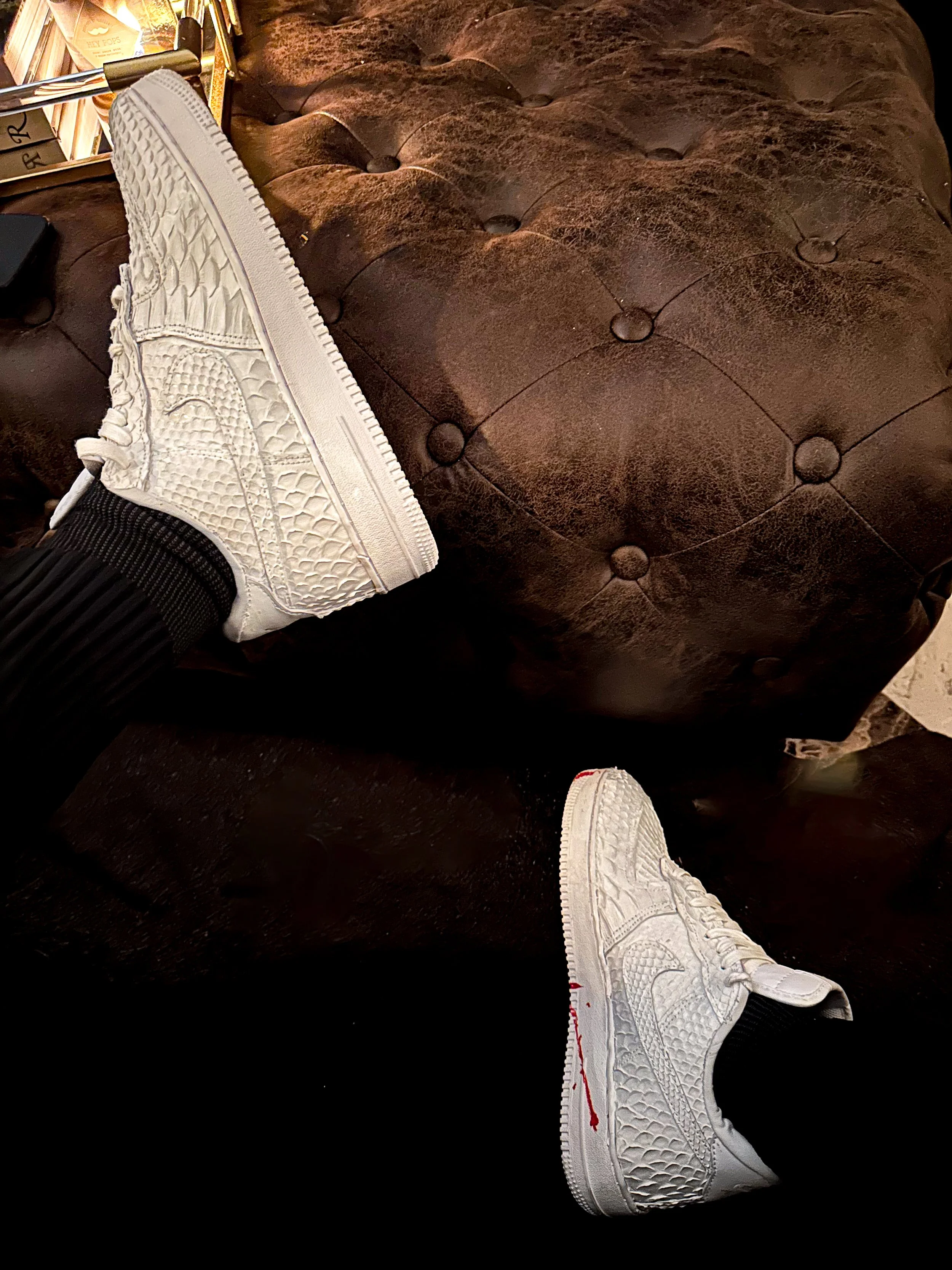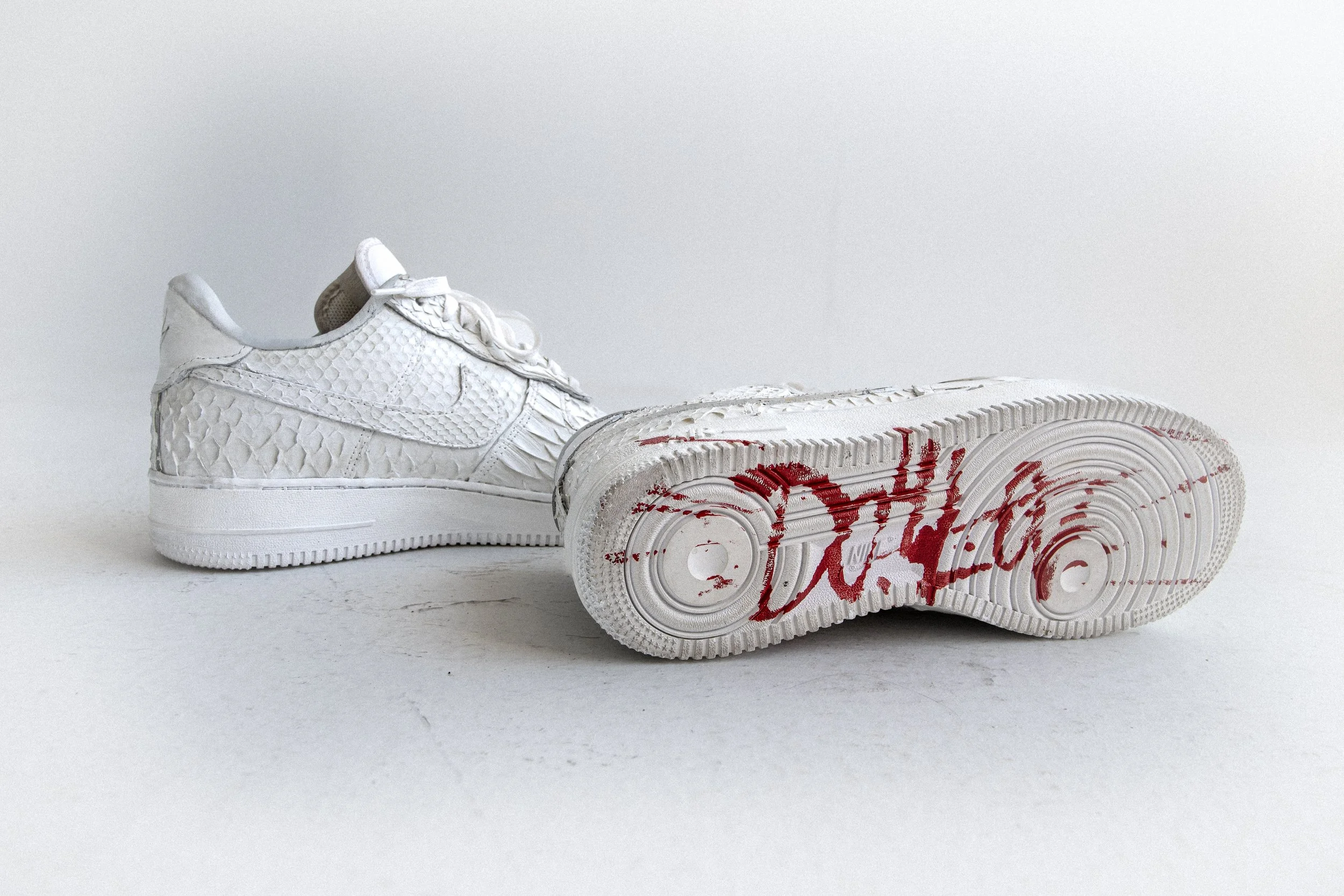 The Knight is a critique of triggered responses to black and white. The concept is a study of how we perceive colors/shades and where our triggers are rooted. The sneaker takes a pure material (white python), and couples it with a broken sole (the red painted sole– singularly represents imperfection and consequence). Compositionally, the materials were selected for their opulent and regal appearance. The qualities are intended to depict conflict between nobility and defection which is how polarizing the shade White is perceived.